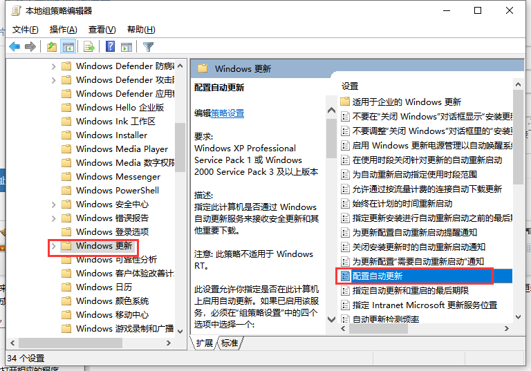 2、在组策略编辑里面点击依次展开【计算机配置 - 管理模板 - Windows 组件 - Windows 更新】,右边找到【配置自动更新】选项。