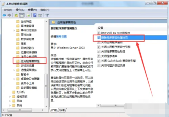 2、在本地策略组编辑器界面中依次展开以下选项:“计算机配置”→“管理模板”→“Windows组建”→“应用程序兼容性”,随后双击打开“删除程序兼容性属性页”。