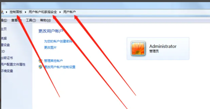 1、win7登录界面怎么切换用户呢?首先进入控制面板\用户帐户和家庭安全\用户帐户\管理帐户。