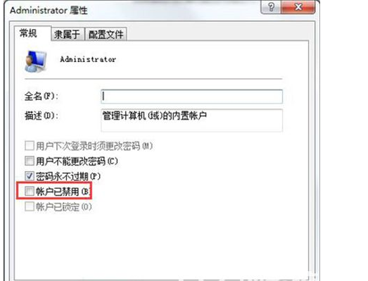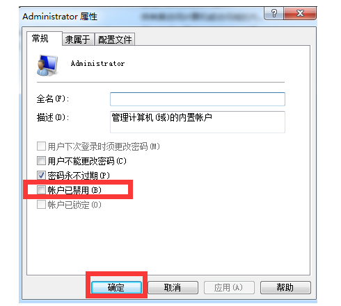 5、在弹出的窗口界面中,取消勾选账户已禁用,点击确定。