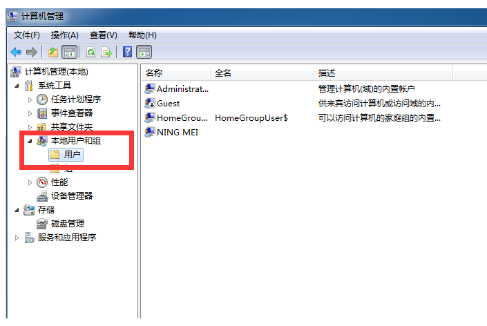 3、在左侧窗口界面中点击本地用户和组,点击用户。