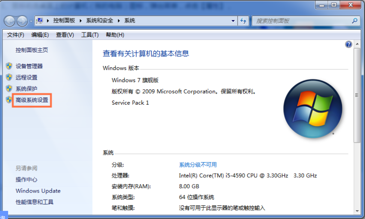 2、路径:控制面板 - 系统和安全 - 系统,点击左侧的高级系统设置。