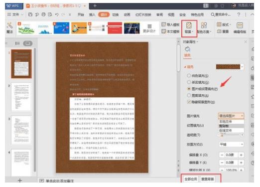 在进行页面上选定一个ppt右键选定“环境”,之后在目标属性栏里挑选“图片或纹路添充”挑选图片,随后点击“全部应用”就可以了。