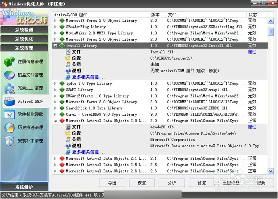 绿色图标表示该ActiveX/COM组件有问题,Windows优化大师允许修复此类组件。