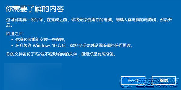 3、仔细阅读注意事项,全过程需要有稳定电源支持,也就是说笔记本和平板电脑需要在接入电源线的状态下进行回退操作,电池模式不被允许;另外,系统还提示了一些关于文件和程序可能受到的影响。了解并采取措施之后,点击“下一步”继续。