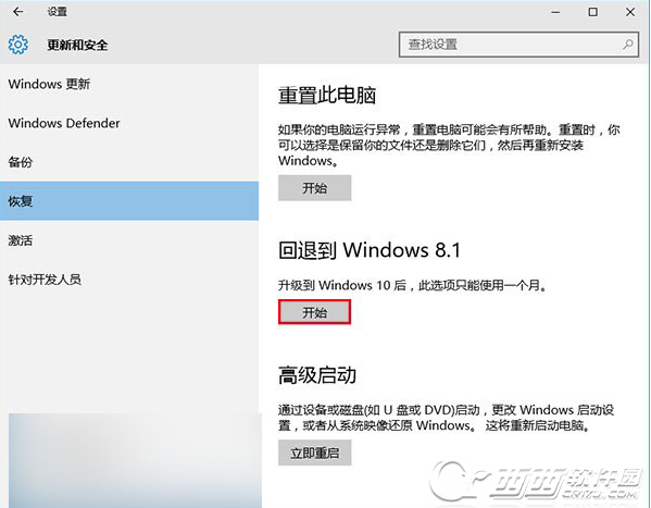 1、打开设置→更新和安全→恢复,找到“回退到Windows7(或Windows 8.1)”,点击“开始”。