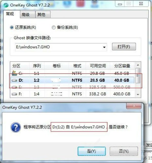 2.在将Win7系统恢复到D盘分区(当然也可以是F: E: 等分区),如图。
