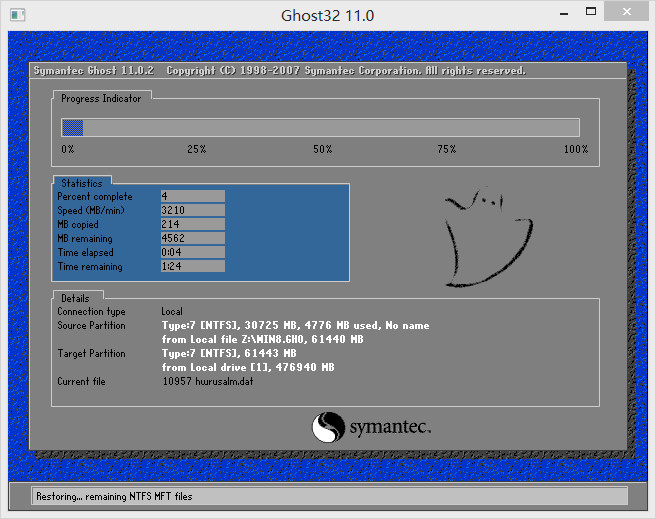 5、磁盘完成格式化后开始还原,等待win8镜像文件安装程序释放,释放完成后会自动重启电脑,如图所示: