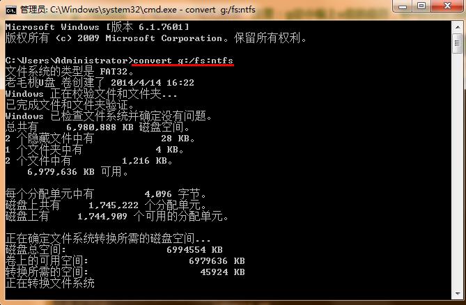 2、打开dos命令提示符界面后,在光标闪动处输入“convert g:/fs:ntfs”(其中g为u盘对应的盘符),按Enter键执行即可,如下图所示: