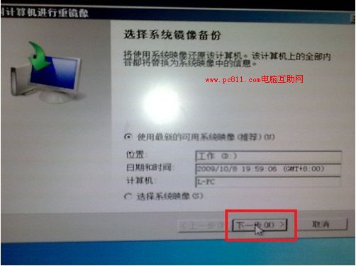 (2)选择映像的存放位置。首先,它会为我们推荐一个最近的备份。小编提醒大家与用还原点修复不同的是,映像一般只创建一次就行了,为此,直接选择它的推荐映像即可。