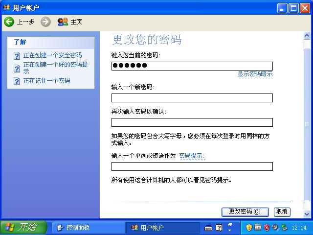 5.在新窗口中的“键入您当前的密码”文本框中我们输入你当前xp系统的登陆密码即可,其余选项不用填写,点击更改密码按钮即可。如图五
