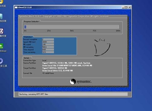 7、接着会弹出的是一个系统还原界面,这时大家可以清楚地看到我们的雨林木风系统还原过程,只等100%完成。