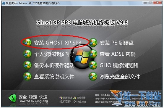 (3)安装方式一:运行文件夹里面的“AUTORUN.EXE”选择第一选项的“安装GHOST XP SP3”就可以默认安装了。如下图