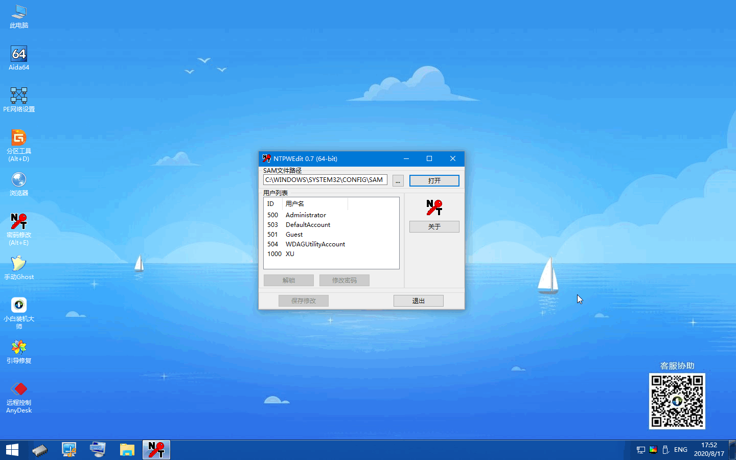 3、进入到小白PE系统中后,在桌面上就有密码修改工具,双击直接打开。在软件中我们直接选择打开按钮,在列表中就会列出我们计算机可用的帐户。