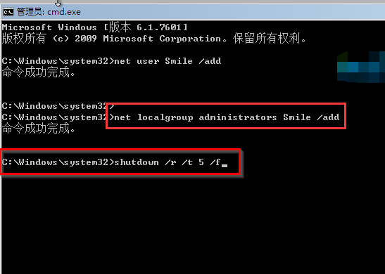 4、接着继续输入【net localgroup administrators Smile /add】然后按回车确定,命令成功后继续输入【shutdown /r /t 5 /f】回车确定。