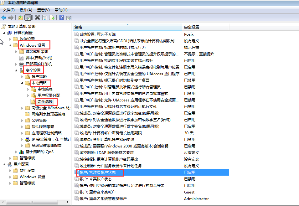 2,依次展开“Windows设置——>安全设置——>本地组策略——>安全选项”,在右侧找到“账户:管理员账户状态”并双击打开。