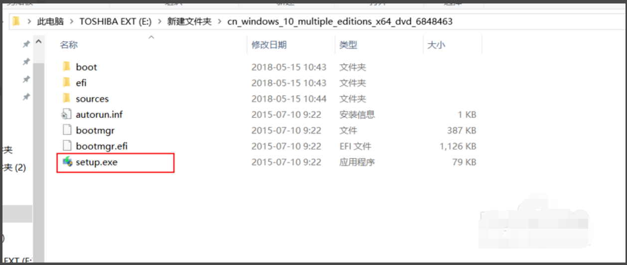 1、首先我们讲win10 iso镜像文件解压,找到解压完成后的文件,并在文件夹里找到setup.exe,然后双击,即可开始安装。