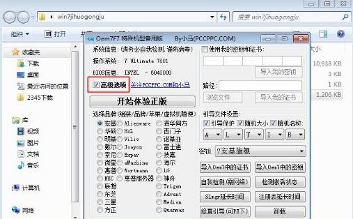 如果勾选【高级选项】,如下图所示,可以选择指定品牌的windows7密钥,以及其他操作,选择之后,依然是点击【开始体验正版】;