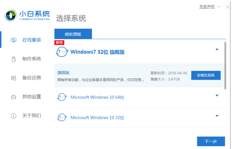 1.搜索下载小白一键重装系统,打开后选择win7系统,点击安装此系统。