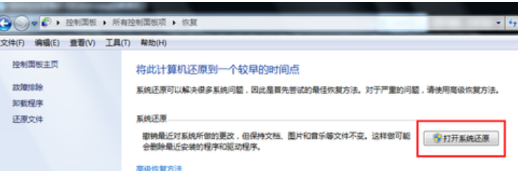 3、点击打开系统还原按钮。