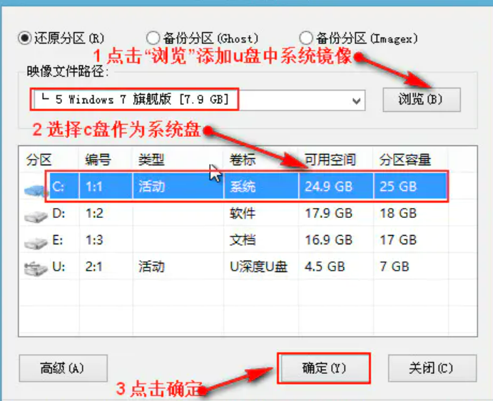 2、然后进入pe后会自启U深度装机工具,点击【浏览】,选择你拷贝在U盘中的win7系统,默认选择C盘安装,点击【确定】。