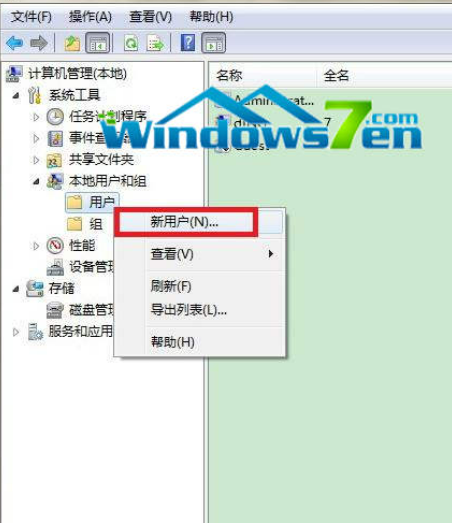 2. 在弹出的“计算机管理”界面中,选择用户和组,右键单击“用户”,然后单击“新用户”以创建一个我们要与之共享文件的新用户;