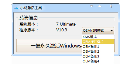 4、在开启的小马 win7激活工具的主界面中,点击页面右边的激话方式选择项,随后在弹出式下拉列表中挑选OEM / EFI方式。