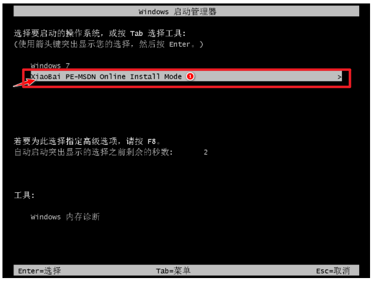 4、电脑重启后,我们要在启动菜单中选择第二个“XiaoBai -MSDN Online Install Mode”菜单,按回车选择并进入。