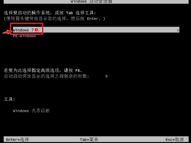 8、重启电脑后在启动菜单中选择“Windows7”进入系统。