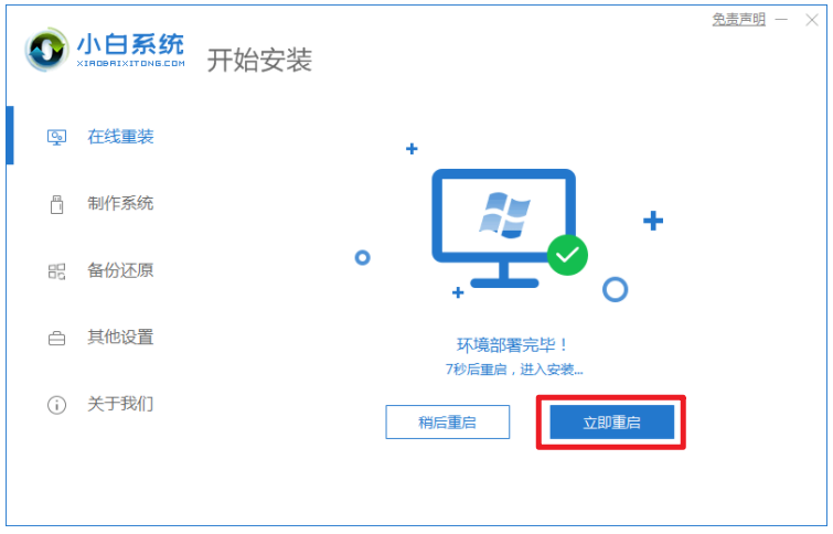 3、等下载完成后会,小白软件会自动进行环境部署,待完成后我们点击“立即重启”。
