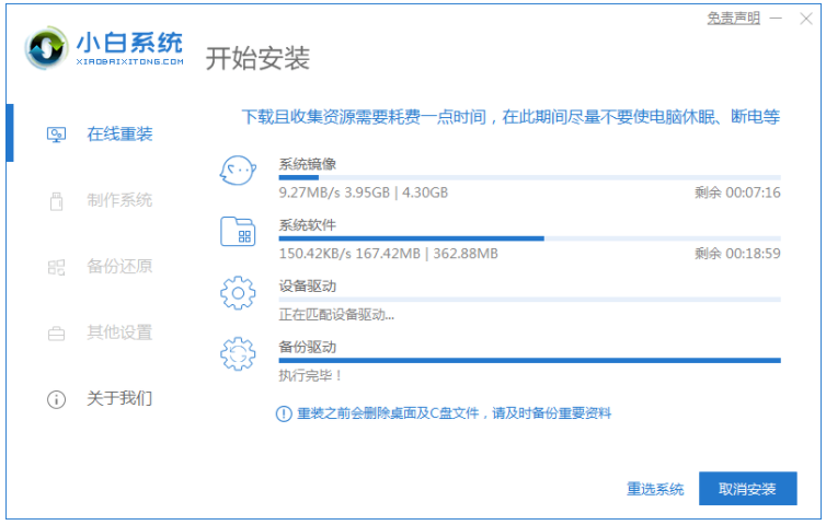 5、进入PE系统,我们点击小白软件会开始自动安装系统操作,我们继续等待安装完成。
