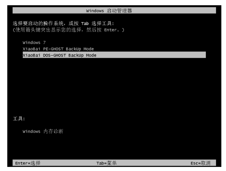 5、在重启后直接使用方向上下键选择最后一个 XiaoBai DOS-GHOST Backup Mode 菜单按回车确定。