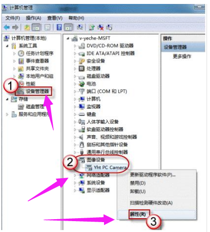 2.在“计算机管理”窗口左边一栏,双击“设备管理器”。然后,从右边栏中找到“图像设备”,点开。在摄像头设备上右键鼠标,选择“属性”。