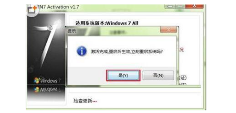 4、当提示激活成功需要重启电脑的时候,直接在对话框中点击是,这样当电脑重启后就可以成功激活系统了。另外我们也可以自己鼠标右击桌面的计算机图标,选择属性打开查看激活状态。