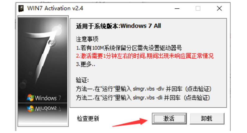2、接着来到win7 activation软件的主界面后,点击界面下方的激活按钮,然后软件便会自动开始激活win7旗舰版系统了。