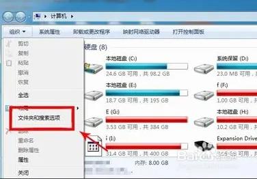 3. 然后双击桌面的计算机图标,或打开资源管理器,依次点击窗口左上角的组织-文件夹和搜索选项,win7隐藏文件就会出现。