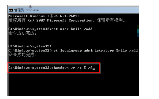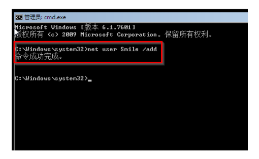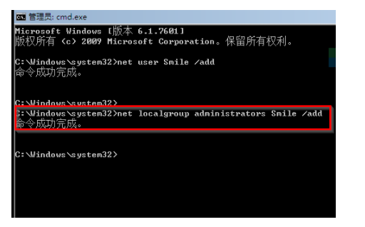 4、然后继续输入net localgroup administrators Smile /add 。