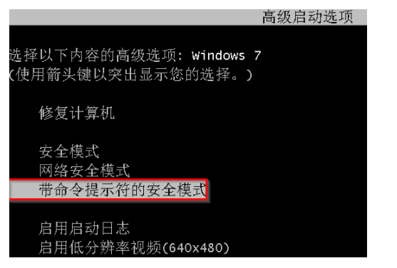 1、电脑开机后不断的敲击F8键,选择“带命令提示符的安全模式”按回车进入。