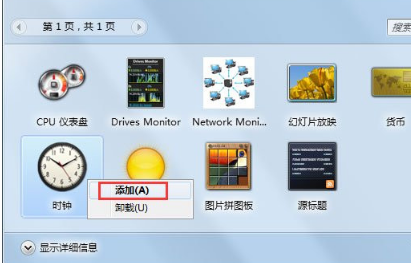 3、打开桌面小工具之后,我们可以看到一些现有小工具; 在要添加的小工具上点击它,将弹出选项,添加或者卸载,选择添加以添加此小工具;