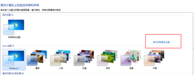 2、点击我们想要更换的win7桌面壁纸主题就可以啦。如果不喜欢的话, 那就点击联机获取更多主题。