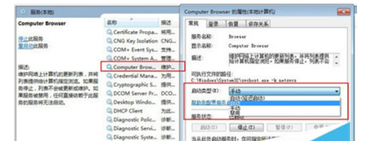 2、在打开的“服务”窗口右侧列表中找到并右键“Computer Browser服务”选择属性,在弹出的窗口中选择“启动类型”,设置为“自动”。
