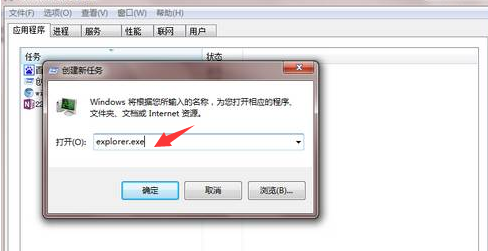 2、弹出来的创建新任务框中,我们输入“explore.exe”,点击确定,win7任务栏就出来啦。