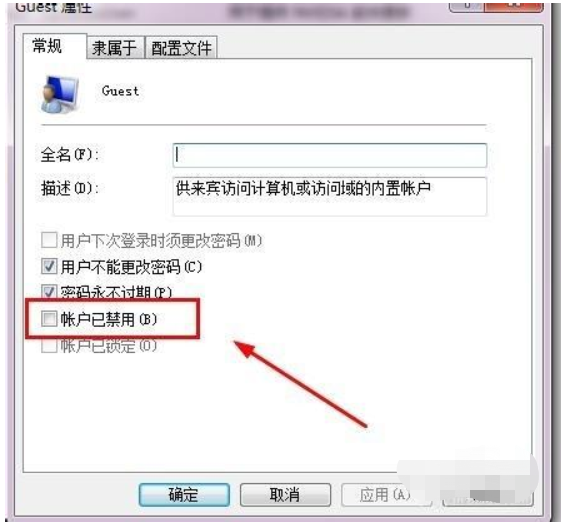5、再将【账户已禁用】前面的勾去掉!单击【应用】——【确定】。就可以生效。