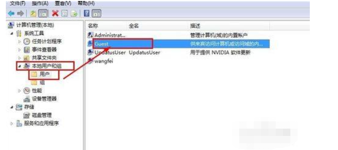4、选择【本地用户和组】——【用户】,双击其中的【Guest】。