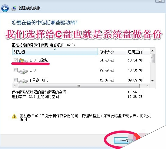 5、选择C盘,要给C盘做备份,然后单击下一步。