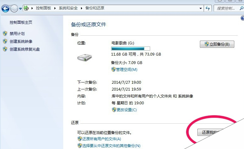 9、以后系统出了问题的时候,可以还原所做的备份。点击“还原我的文件”。