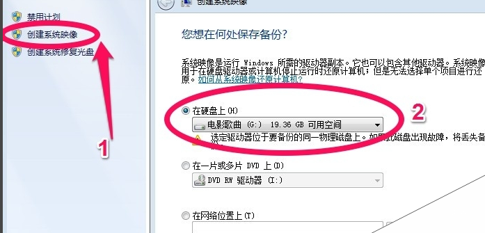 4、选择创建系统映像,然后选择把备份保存在那个盘,因为要对系统做备份,所以不要选择C盘保存备份,然后下一步。