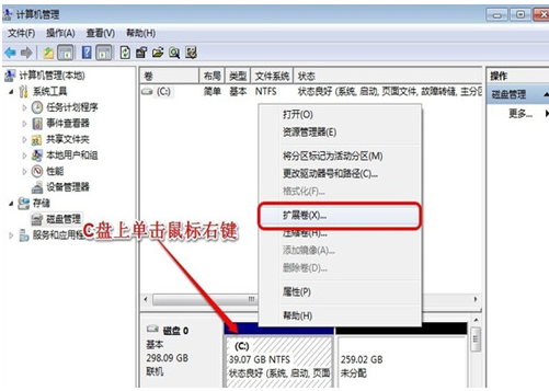 5、我们继续鼠标右键重新点击c盘,选择【扩展卷】。