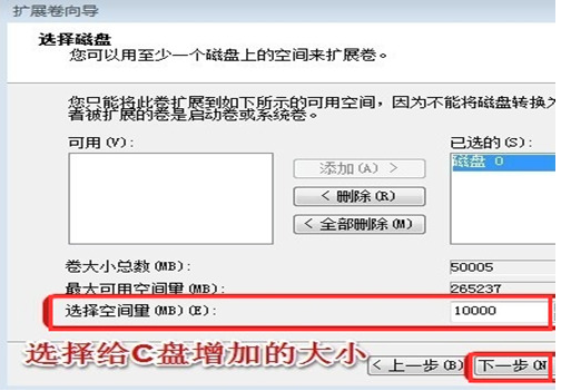 6、在【选择空间量】里填入之前压缩的磁盘空间,点击【下一步】,按照提示操作【完成】即可实现给win7增加c盘空间目的了。