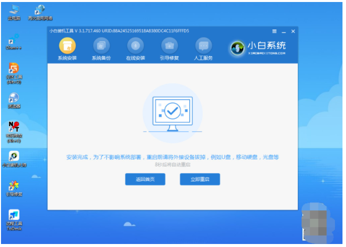 3、在pe系统内软件将会自动安装成功后选择重启电脑;